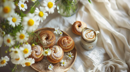 A cinnamon rolls and coffee on table, surrounded by daisies in ceramic vases.