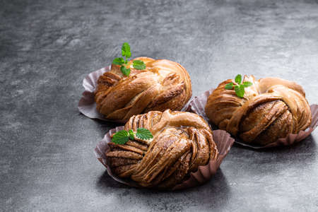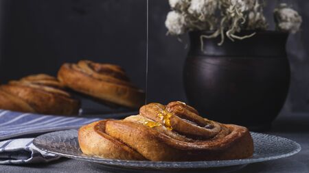 Appetizing cinnamon buns with caramel glaze in shape of snail