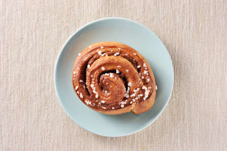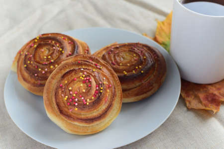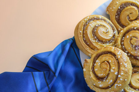 Cinnamon rolls on white plate and peach background and blue textiles. close up