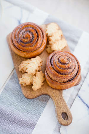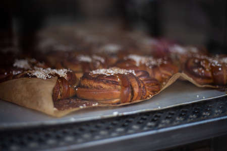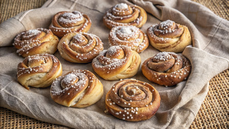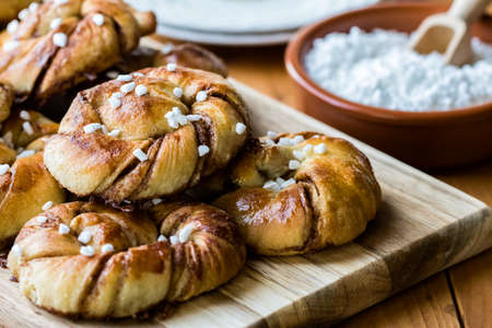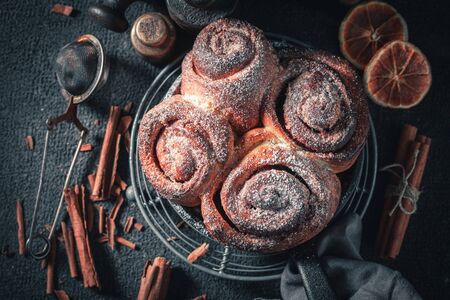 Freshly baked cinnamon buns as swedish christmas dessert.
