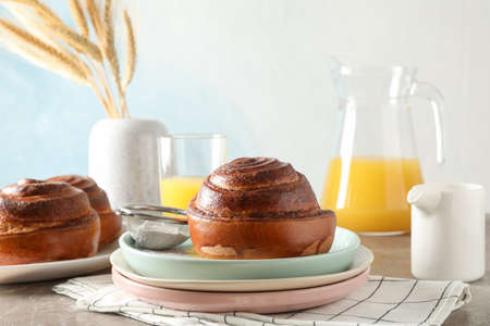 Freshly baked cinnamon roll on color plate with orange juice on brown background, space for text