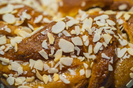 Fresh pastry crunch with maple syrup sprinkled with sliced almonds.