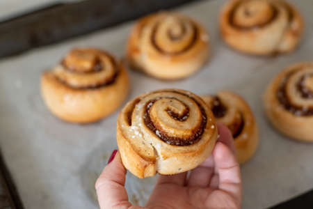 Woman's Hand Holding Delicious Swedish Buns, Kanelbullar. Baking close-up. traditional Swedish pastries. Scandinavian cuisine.