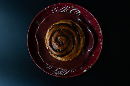 Freshly baked cinnamon roll with spices and cocoa filling on a black background. Cinnabon buns. Swedish breakfast.