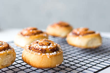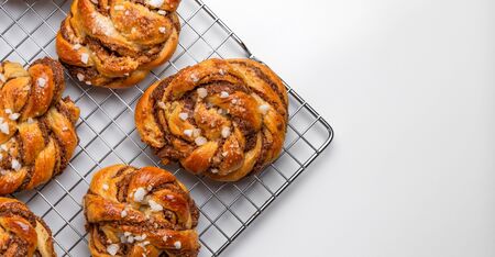 Aerial view of several homemade baked Swedish cinnamon rolls or kanelbulle on a cooling rack. White background with copy space to add text.