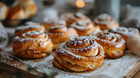 Top view of freshly baked cinnamon buns rolls with sugar and flour. Aesthetic food advertising concept. Generative AI.