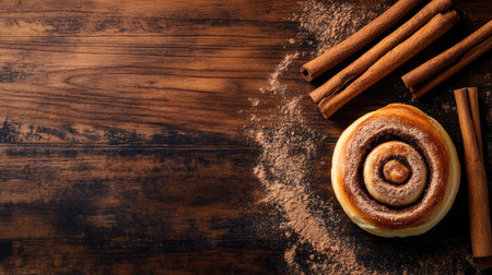 A delicious cinnamon roll with a perfect swirl, surrounded by cinnamon sticks and sugar. Ideal for food photography, cooking blogs, or recipes.
