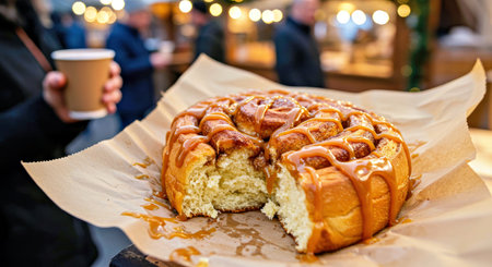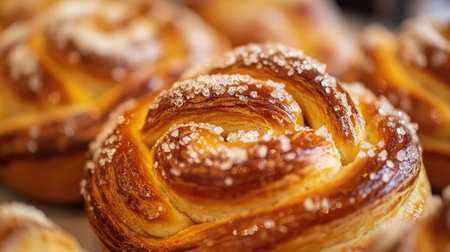 A close-up of Swedish cinnamon bun (kanelbulle) with sugar crystals, fresh from a street food stall, highlighting its swirled, golden-brown crust.