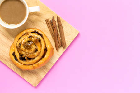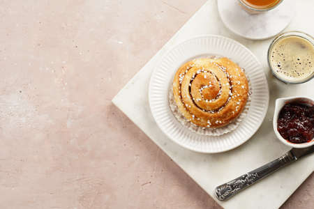 A round cinnamon pastry on a white plate on marble board on light pink background, cup of coffee, jam, milk