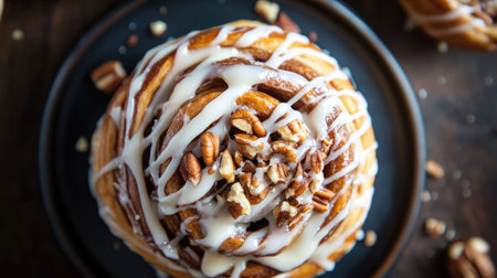 Top view of a decadent cinnamon roll drizzled with icing and sprinkled with nuts