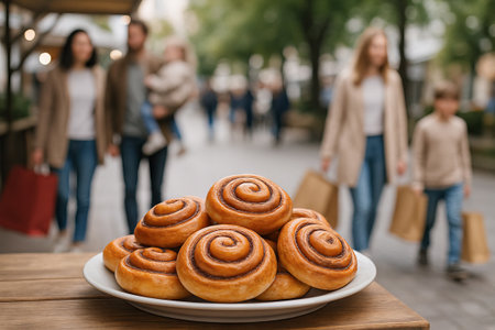 Morning cinnamon rolls on outdoor cafe counter in busy city street on a sunny day. concept of fresh pastries, urban lifestyle, bakery delight.
