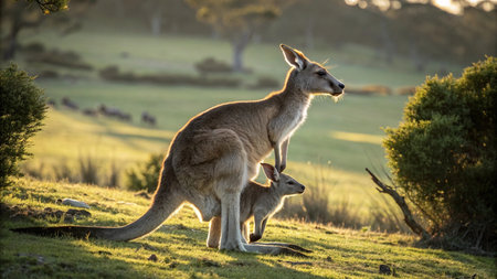 Kangaroo and joey in the morning light, Australia.