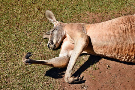 Very muscular wild red kangaroo lying with hand up on the ground in Queensland, Australia