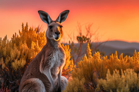 A kangaroo stands tall in the Australian outback, bathed in the golden light of the setting sun