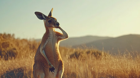 A kangaroo stands gracefully in a golden field during sunset, showcasing its natural beauty. The serene landscape captures the essence of Australian wildlife.
