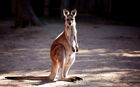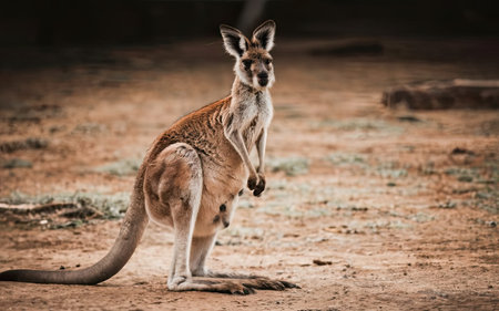 Kangaroo standing on the ground and looking at the camera.