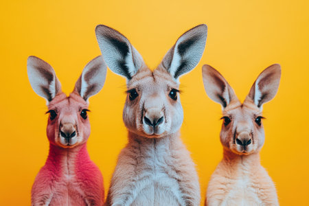 Three kangaroos stand in a row with different fur colors against a vibrant yellow background showcasing their distinct and playful appearances.