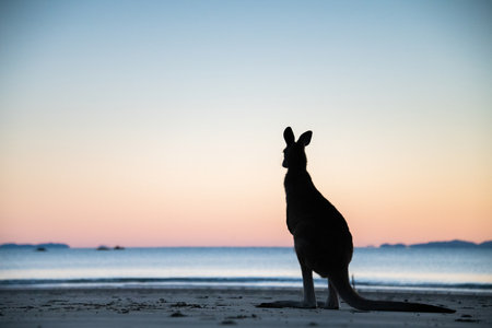 A kangaroo stands on a sandy beach, silhouetted against a vibrant sunset. The sky displays hues of orange and purple. The kangaroo's fur contrasts against the soft colors. This image could be used for various purposes including editorial and commercial projects.