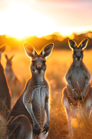 Kangaroo standing in the savanna with setting sun shining. Group of wild animals in nature.