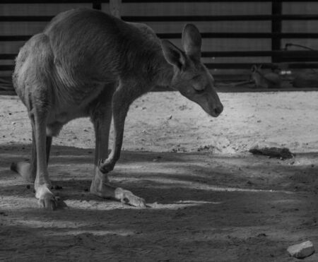 Kangaroo waiting fo food in a zoo, a leaping mammal of Australia and nearby islands that feeds on plants