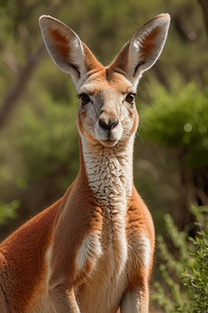 a kangaroo sitting in a forest, basking in the warm sunlight. this photorealistic rendering captures the essence of nature in a high-quality photo. the macro photography highlights the intricate details of the kangaroo's character design. the light amber and red hues add depth and beauty to this national geographic-worthy image. ai generated