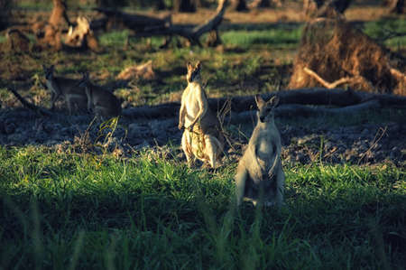 Kangaroo standing in the savanna with setting sun shining. Group of wild animals in nature.