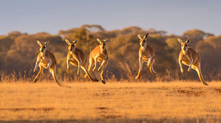 A majestic wild kangaroo captured mid-jump in the outback field during sunset, highlighting wildlife and nature.