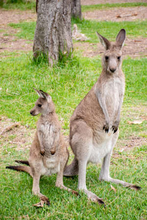 Joey kangaroo and mother kangaroo standing in the bush. Australian wildlife