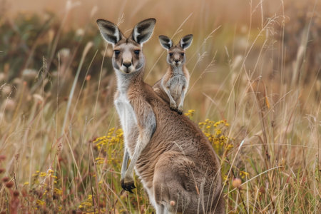 kangaroo mother with her joey peeking out of the pouch, looking curious and playful, created with generative ai