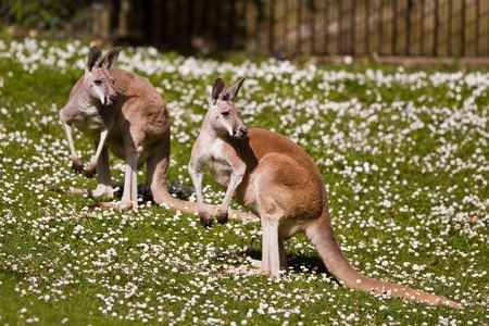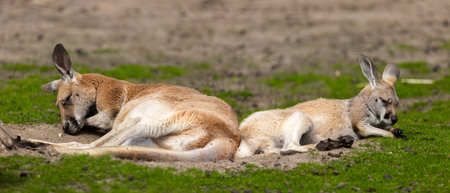 Red kangaroos are resting in the zoo's paddock. Photo taken at noon on a sunny day