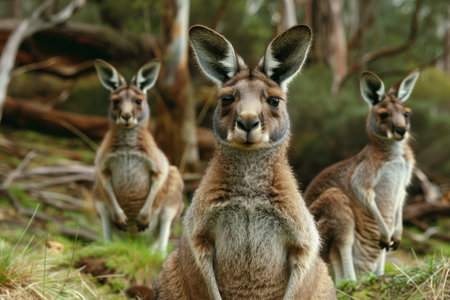 A family of kangaroos standing upright in a forest setting, A kangaroo family gathered together in a peaceful clearing
