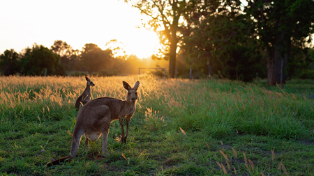 Two Australian kangaroos standing in a field bathed in the golden light of sunset, just before dusk