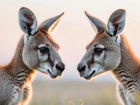 Two kangaroos share a tender moment, touching noses in a field bathed in the golden light of sunset, depicting wildlife emotion and natural beauty