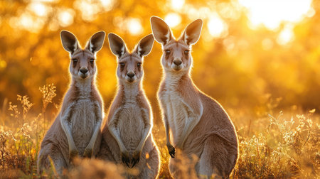 Three kangaroos are resting peacefully under a tree in the Australian outback, bathed in golden sunlight. A serene scene showcasing wildlife in nature.