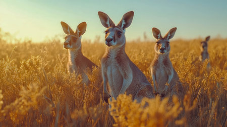 Kangaroo standing in the savanna with setting sun shining. Group of wild animals in nature. Horizontal, banner.