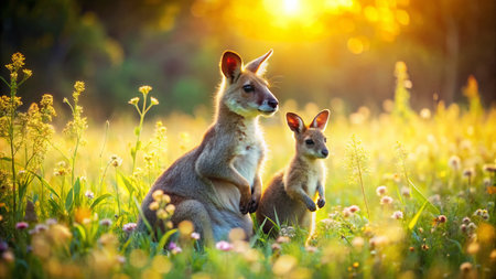 Double Exposure: Wallaby & Joey in Lush Meadow - Nature Stock Photo