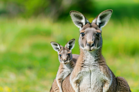 A mother kangaroo stands proudly with her joey peeking from her pouch, surrounded by vibrant greenery under a clear blue sky. Nature's beauty captures a tender moment in the wild.