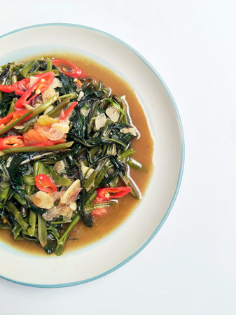 Stir-Fried Chinese Morning Glory or Water Spinach isolated on white background