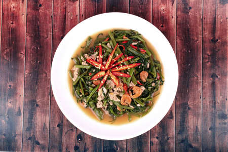 Thai Chinese food,Fried spicy Chinese morning glory with minced pork and dried shrimps .