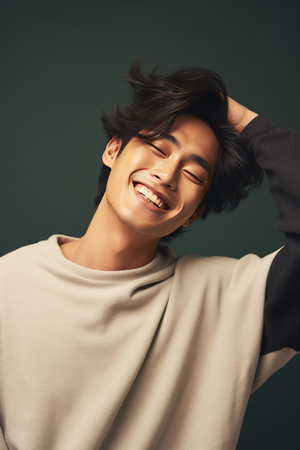 Vibrant and Playful Portrait Photograph of a Charming and Friendly Young Korean Man with a Bright Joyful Smile and Lively Facial Expression Against a Soft Pink Background