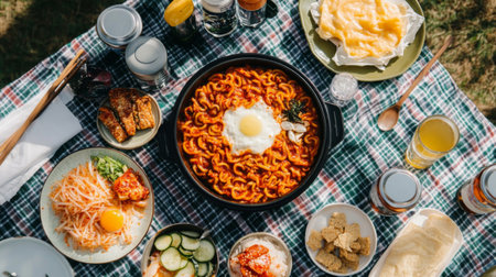 A top-down view of a picnic spread featuring tteokbokki alongside various Korean snacks and beverages, creating a delightful and inviting atmosphere for outdoor dining.