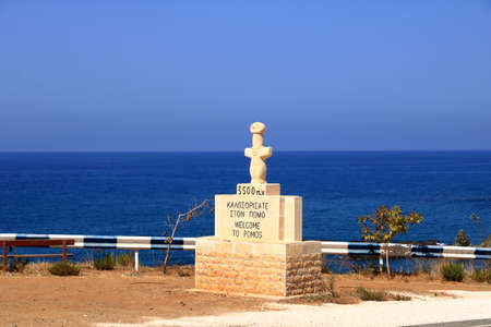 Pomos village, Paphos district, Representation of the Idol of Pomos on the welcome sign. Translation of the Greek words: 3500 BC, Welcome to Pomos