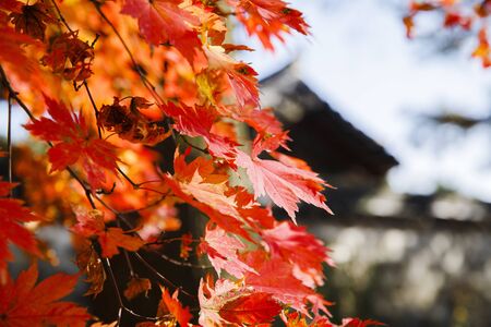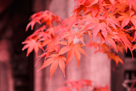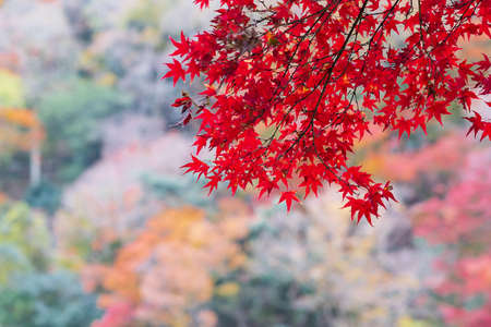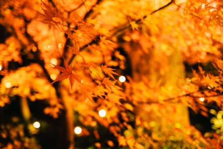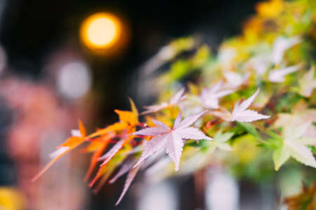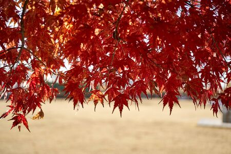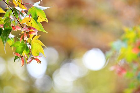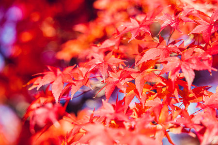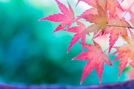 Beautiful maple leaves in autumn sunny day at foreground and blurry background in Taiwan, with no people, close up, copy space, macro shot.