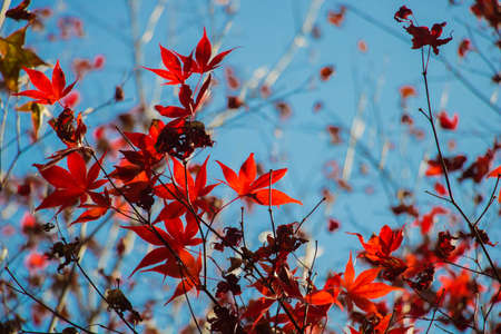 Leaves of red color maple in the fall with the sky as the background, Bokeh fading.