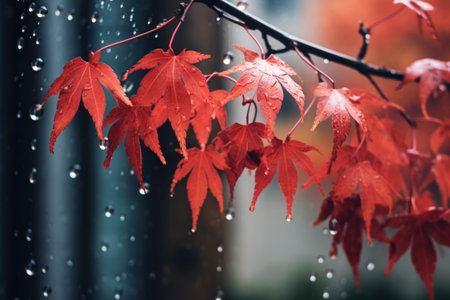 Close-up view of colorful Autumn tree leaves in rain. Autumn seasonal concept. AI generated.