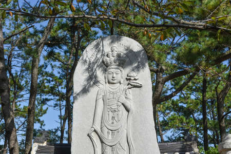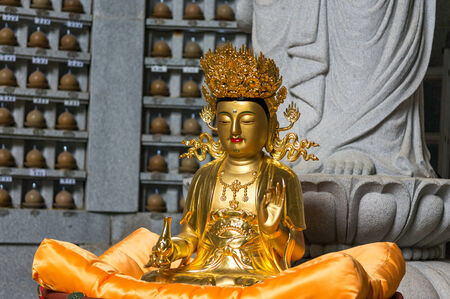 Busan, South Korea, September 12, 2019: one of the Golden Buddhas of Haedong Yonggung Temple with overcast skies on abckground