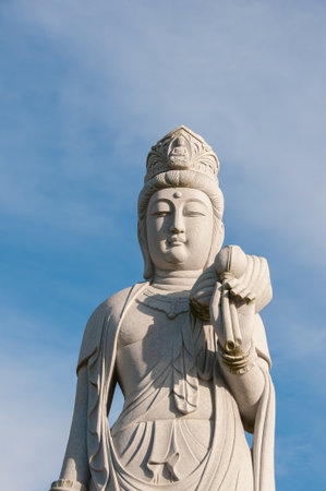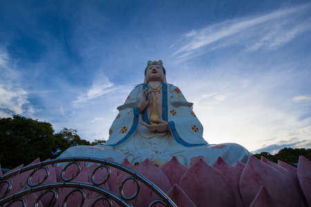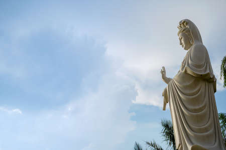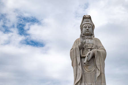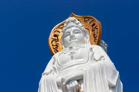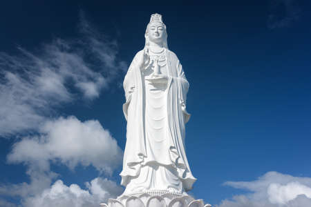 Majestic white Buddha statue on blue sky background. The Lady Buddha (the Bodhisattva of Mercy) at the Linh Ung Pagoda in Danang (Da Nang), Vietnam.