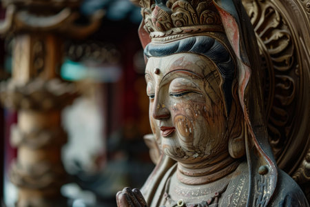 Detailed carving of a serene buddha statue with intricate designs in a temple setting