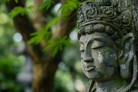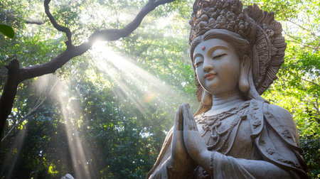 A serene statue stands amidst lush greenery, illuminated by soft sunlight rays. This tranquil scene captures a moment of peace and spirituality in nature.