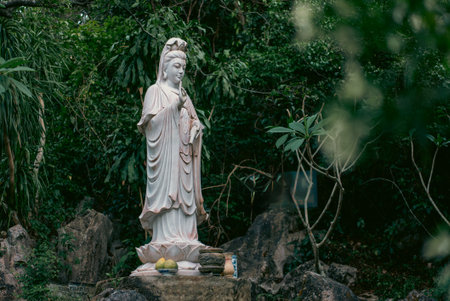 Serene marble statue of Guanyin in forest shrine with offerings at the base, Peaceful Buddhist female figure in jungle setting with altar and sacred atmosphere